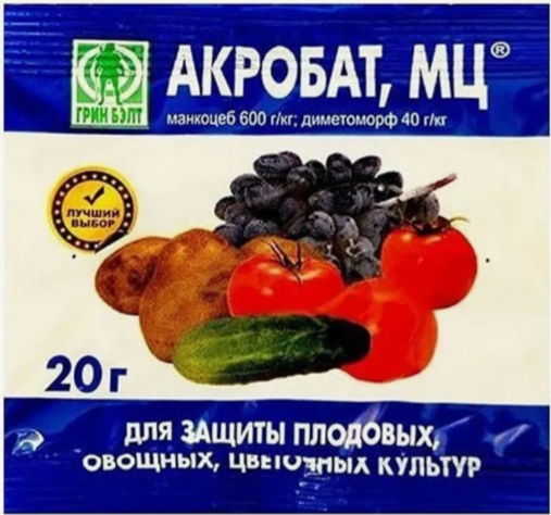 Акробат МЦ – Локально-системный комбинированный фунгицид для борьбы с фитофторозом и альтернариозом картофеля, милдью винограда и пероноспорозом огурца. Диметоморф и контактный манкоцеб предотвращяют развитие возбудителей фитофтороза как на поверхности растения, так и в его тканях, что дает длительный профилактический и лечебный эффект.