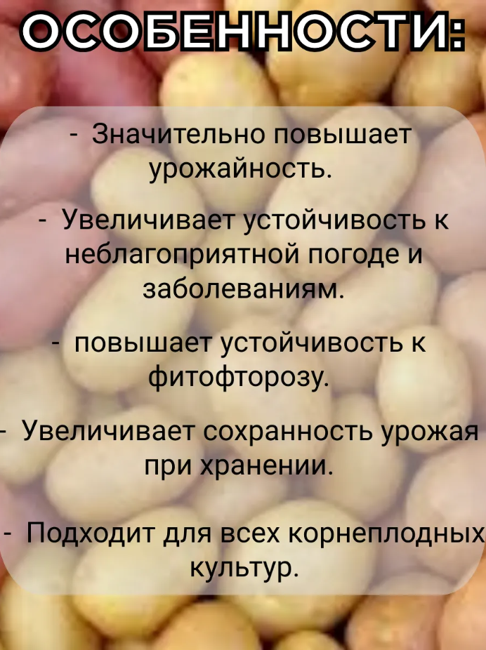 Продлению сроков хранения: благодаря сбалансированному составу, удобрение помогает продлить сроки хранения картофеля, сохраняя его качество и свежесть.