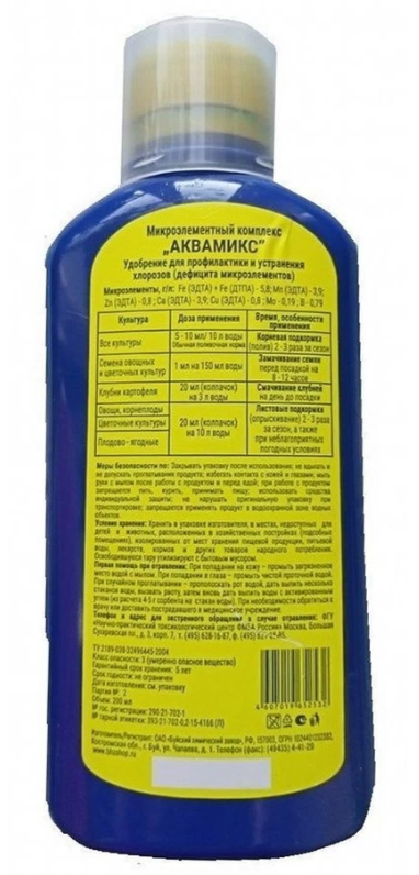 Концентрированное удобрение Аквамикс 200мл - микроэлементный комплекс (жидкий), витамины для растений. Средство для замачивания семян, профилактике хлорозов и устранения дефицита микроэлементов.. Универсальное решение для успешного выращивания рассады и улучшения почвенного состава. Это специально разработанное удобрение предоставляет растениям все необходимые питательные вещества для оптимального роста и развития. Сбалансированный комплекс высокоэффективных, легкодоступных для растений микроэлементов – Fe, Mn, Zn, Cu, Ca в виде сложных органических солей – хелатов, а также B, Mo. За счет этих элементов увеличивается урожайность, они способствуют полному и сбалансированному усвоению питательных веществ из почвы, повышают устойчивость к болезням, засухе, холоду, ускоряют и улучшают цветение, увеличивают количество завязей, снижают уровень нитратов в овощах и фруктах. На практике садоводам затруднительно вносить микроэлементы отдельно. Внесение их в состав микроудобрения Аквамикс существенно упрощает этот процесс, а так как они содержатся в физиологически выверенных пропорциях, нет риска излишнего внесения.