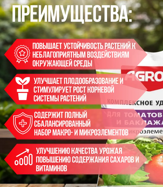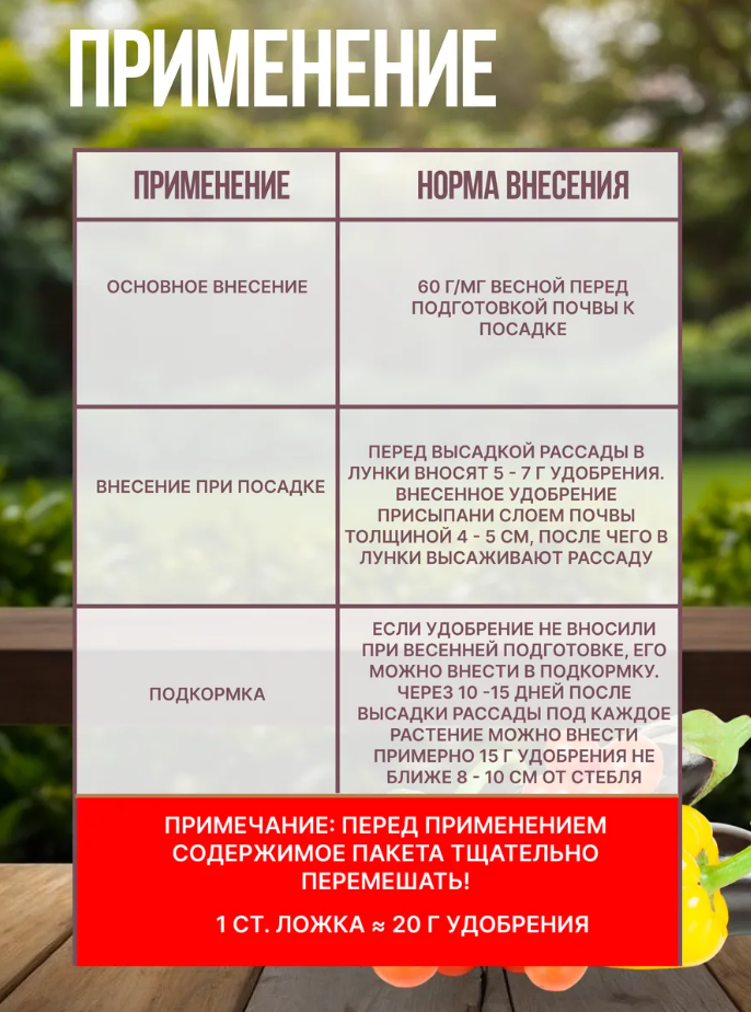 Специальное комплексное смешанное минеральное удобре- ние для основного внесения и для подкормок при выращивании томатов, перцев, баклажанов, физалиса в открытом и защищенном грунте. Содержит полный сбалансированный набор микро- и макро- элементов питания, необходимых для нормального роста и раз- вития растений. Улучшает плодообразование и стимулирует рост корневой системы растений, повышает устойчивость растений к неблагоприятным воздействиям окружающей среды, болезням и вредителям. Способствует ускорению созревания и улучшению качества урожая, повышению содержания сахаров и витаминов.
