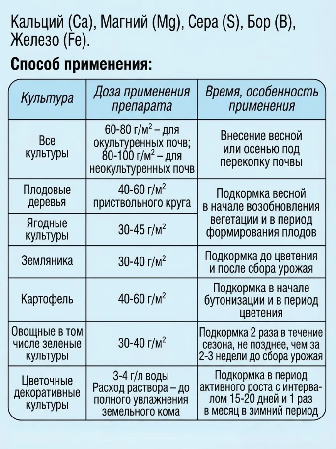 Обогащено микроэлементами — помимо основных элементов, содержит магний (Mg), кальций (Ca), серу (S), бор (B) и железо (Fe), что предотвращает дефицит питания и повышает устойчивость растений к заболеваниям. Универсальность применения — идеально подходит для: · подкормки картофеля перед посадкой и в период вегетации;