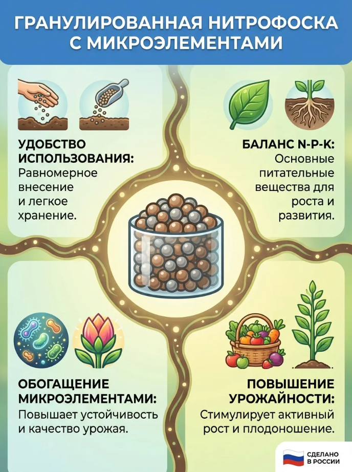 Универсальное азотно-фосфорно-калийное минеральное удобрение «Нитрофоска с микроэлементами» содержит основные элементы питания, необходимые для нормального роста и развития растений. Применяется в качестве основного удобрения и для подкормок. Используется на всех типах почв и под все виды садовых и овощных культур в открытом и защищённом грунте. Благодаря наличию в составе комплекса микроэлементов гарантирует богатый и высококачественный урожай выращиваемых культур.