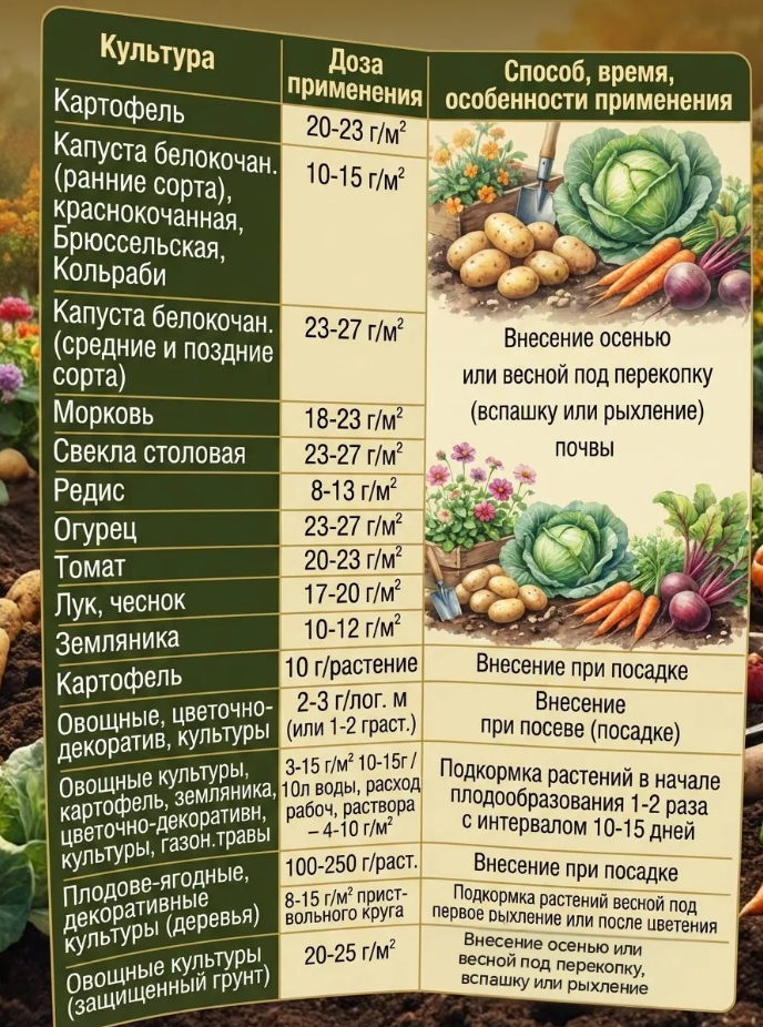 Азот (N) - не менее 6%- Фосфор (P2O5) - не менее 26%- Микроэлементы: Кальций(Ca), Магний(Mg), Сера(S), Бор(B), Железо(Fe). используют для подкормок любых овощей, ягод, фруктов, плодовых деревьев и кустарников, декоративных цветов и растений на окультуренных и неокультуренных почвах. В почву удобрение вносится по осени или ранней весной, чтобы фосфор успел «разойтись» по почве.