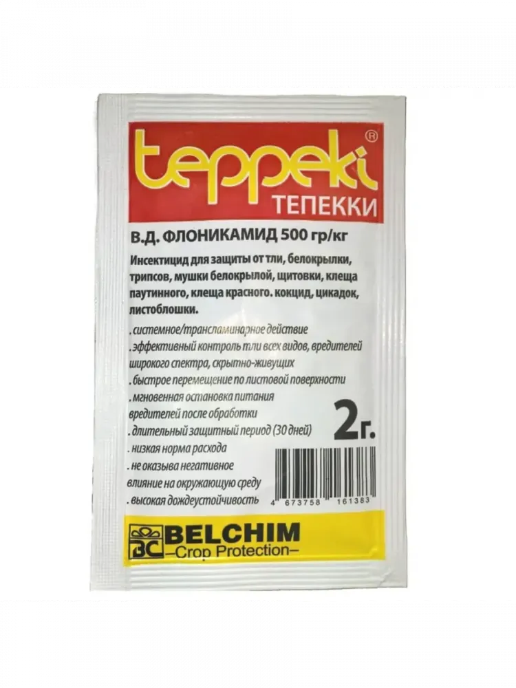 Отличительной особенностью Теппеки является так называемый стоп-эффект – остановка питания в течение получаса после обработки. Применяют инсектицид и в открытых грунтах, и в тепличных конструкциях. Кроме того, у вредителей не вырабатывается сопротивляемость к инсектициду, а также он не наносит вреда насекомым-опылителям.